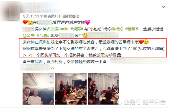 2月3日,有网友在深圳某餐厅偶遇刘涛,她和“小包总”杨烁、金晨等剧组演员一起来到餐厅吃饭,当天的刘涛看起来心情大好,笑容灿烂,看来完全没有受到近来离婚传言的影响。